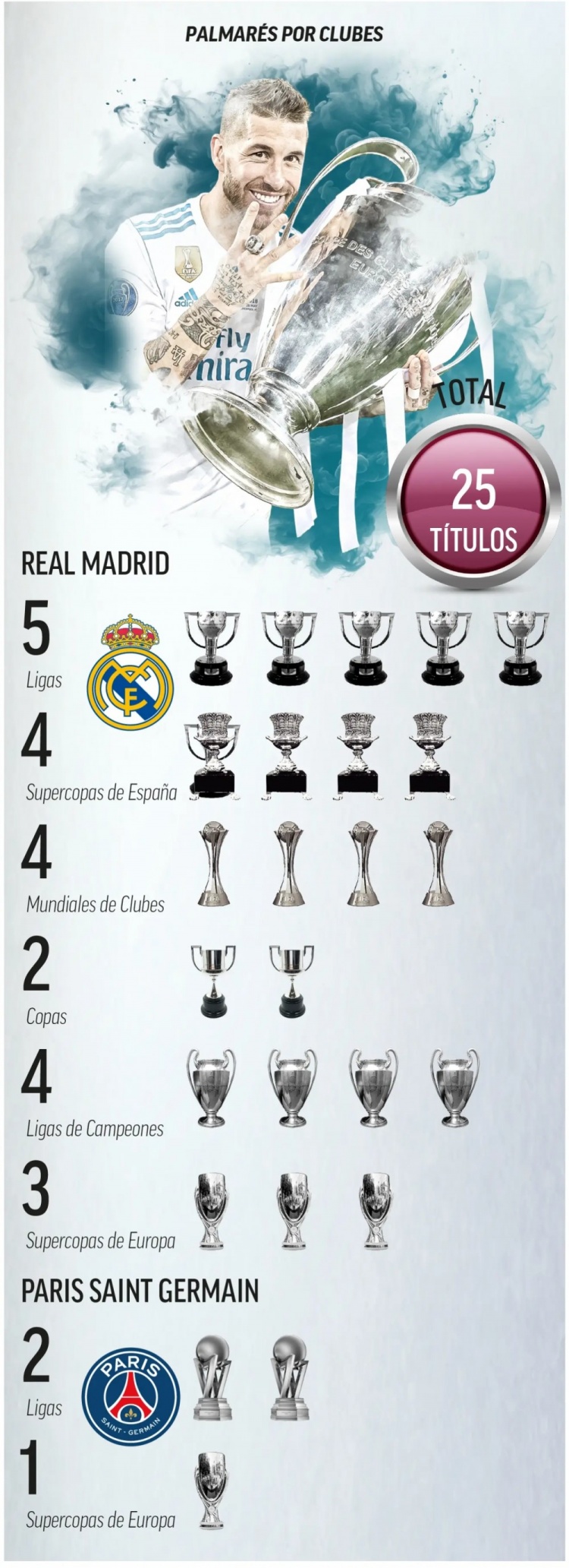 拉莫斯是西班牙黄金一代的核心成员,随队拿下2008年、2012年两届欧洲杯冠军,以及2010年南非世界杯冠军。效力皇马期间,他斩获了所有能拿下的荣誉(联赛冠军、欧冠冠军、国王杯冠军……)。除此之外,2014年欧冠决赛对阵马竞,他顶入那记经典头球,助力白衣军团拿下队史第十座欧冠奖杯。那载入史册的第93分钟,早已定格在足球史与皇马队史的丰碑之上,无论他今后去往何处踢球,哪怕他现在宣布退役,这一点都毋庸置疑。